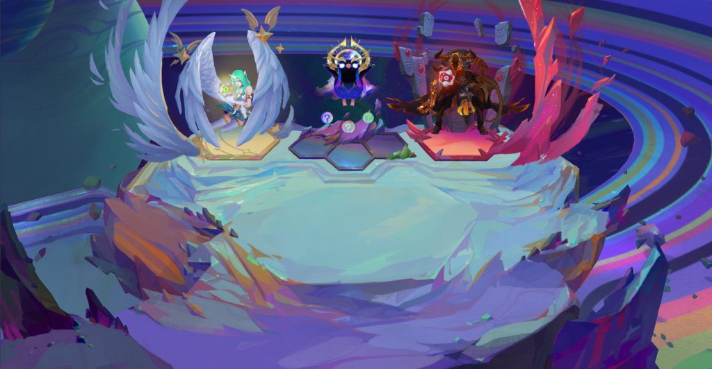 1) A mecânica do conjunto Reino dos Deuses é um mercado celestial que exibe as ofertas dos Deuses para os jogadores – substituindo o carrossel tradicional de TFT neste conjunto.